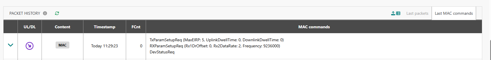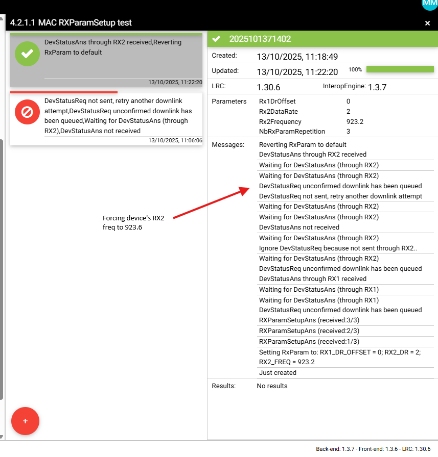 - But the test fails on DevStatusReq sent on RX2. The DevStatusReq is sent on Rx2 using 923.6 MHz while the RxParamsSetup required 923.2 Mhz.